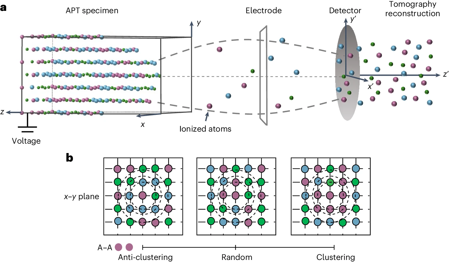 a, APT where the ionization of atoms under a standing field result in their field evaporation towards a detector. Time-of-flight measurements precisely indicate the mass-to-charge ratio, revealing the chemical identity of each individual evaporated ion. A position-sensitive detector enables a tomographic reconstruction atomic layer by atomic layer using a reverse-projection algorithm. Millions (~106–109) of atoms from the analysed specimen can be reconstructed into tomographic atom maps47. The primacy of the issues of ionic trajectory and detector efficiency on the spatial resolution of the tomographic reconstruction is apparent. b, Two-dimensional schematic of anti-clustering, random and clustering SRO behaviours (refer to the purple atom pairs within first NN).